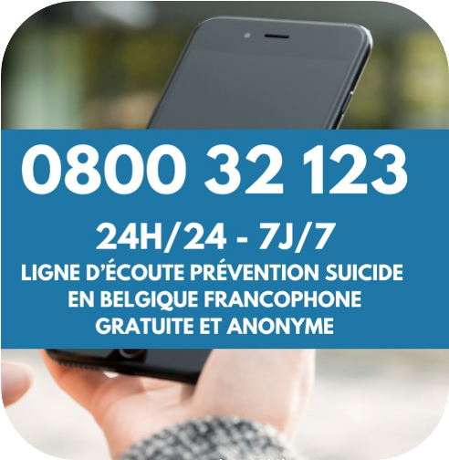 Le 0800 32 123 est la ligne d'écoute spécialisée en prévention du suicide ouverte 24h/24 et 7j/7 en Belgique francophone. Elle est animée par le Centre de Prévention du Suicide.